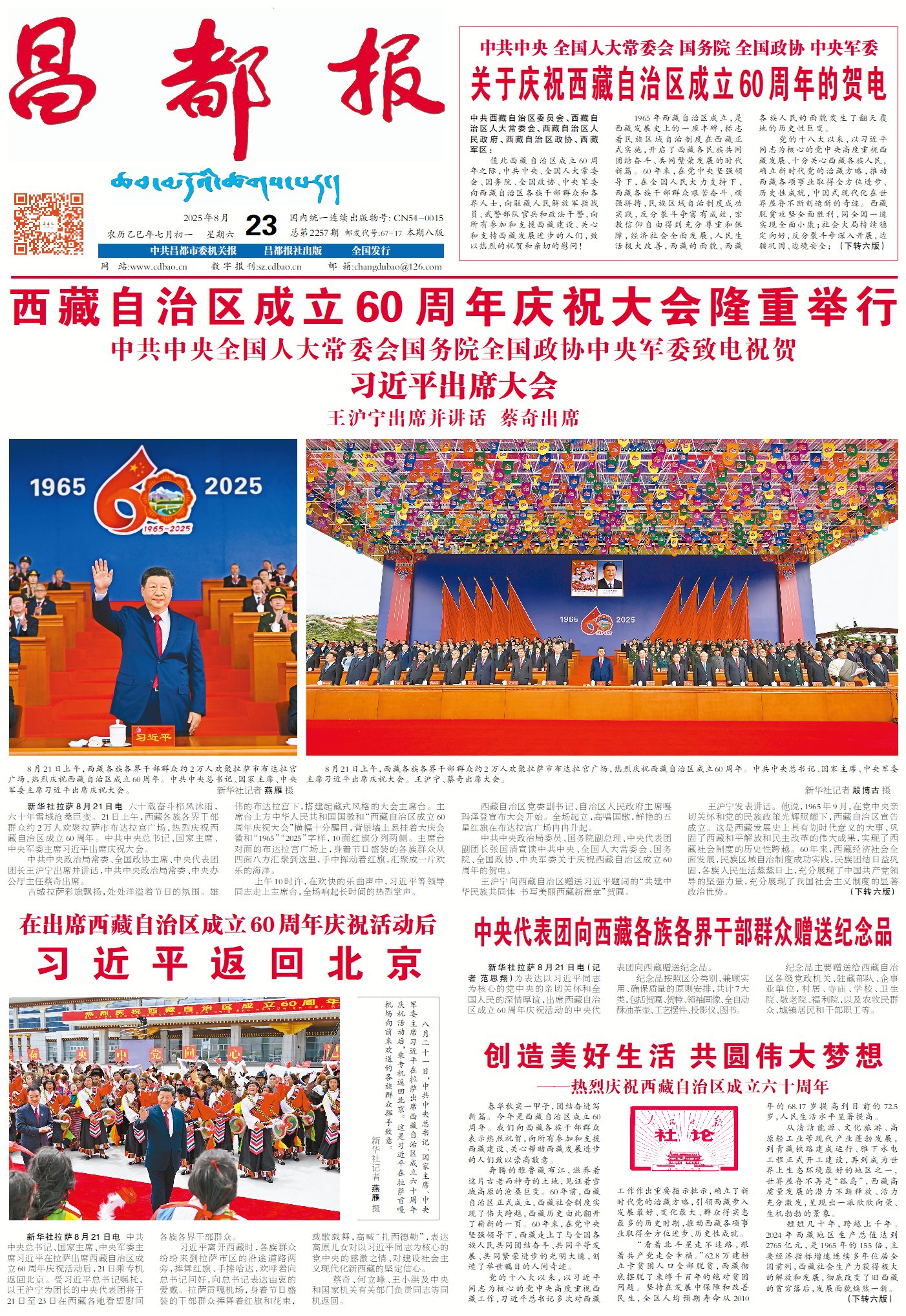 春華秋實一甲子,團結(jié)奮進寫新篇。今年是西藏自治區(qū)成立60周年。我們向西藏各族干部群眾表示熱烈祝賀,向所有參加和支援西藏建設(shè)、關(guān)心幫助西藏發(fā)展進步的人們致以崇高敬意。